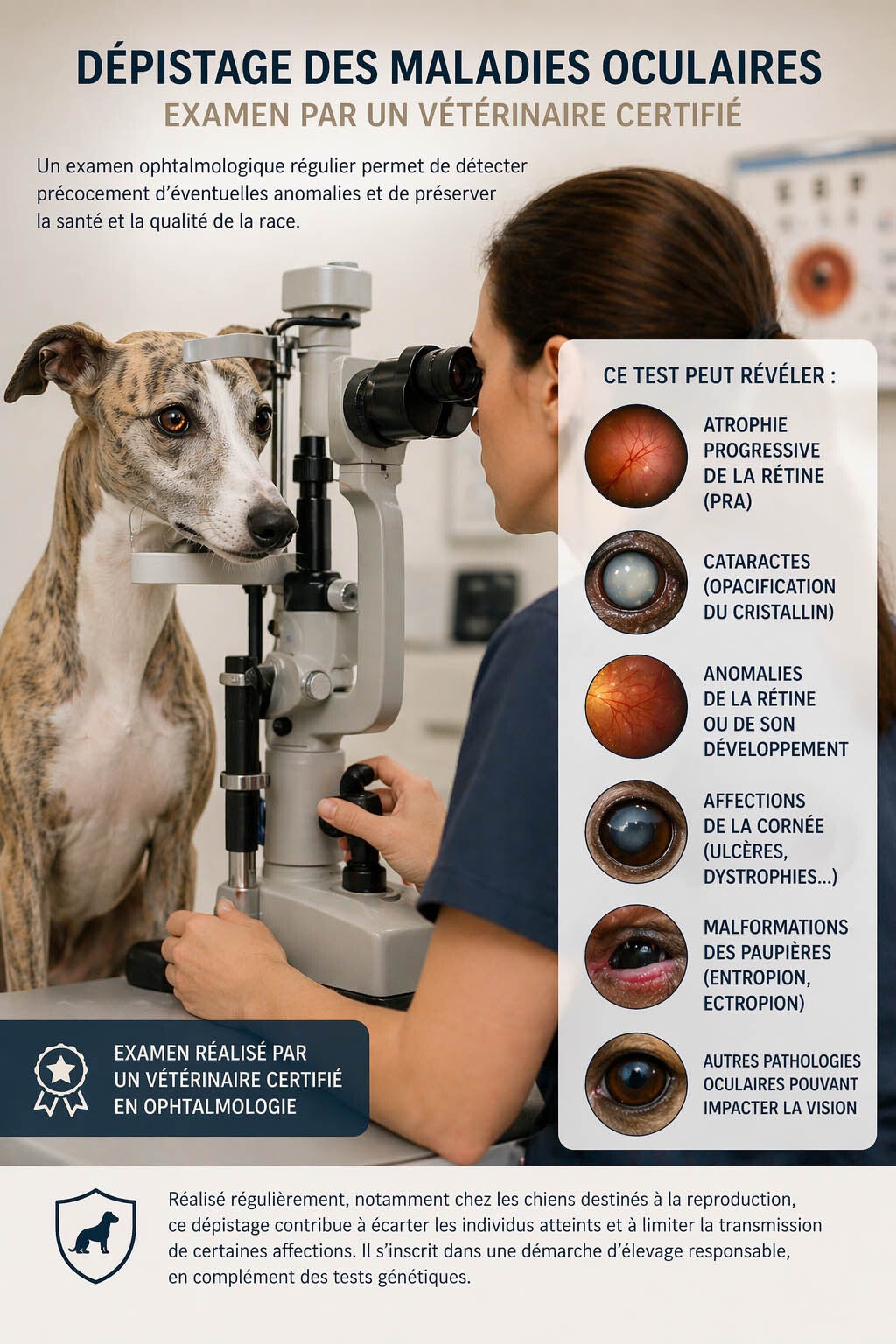 Le dépistage des maladies oculaires chez le Whippet ne repose pas uniquement sur la génétique : l’examen clinique réalisé par un vétérinaire certifié en ophtalmologie est indispensable pour évaluer concrètement la santé des yeux. Cet examen permet de détecter précocement des anomalies parfois invisibles au quotidien et non identifiables par les seuls tests ADN.